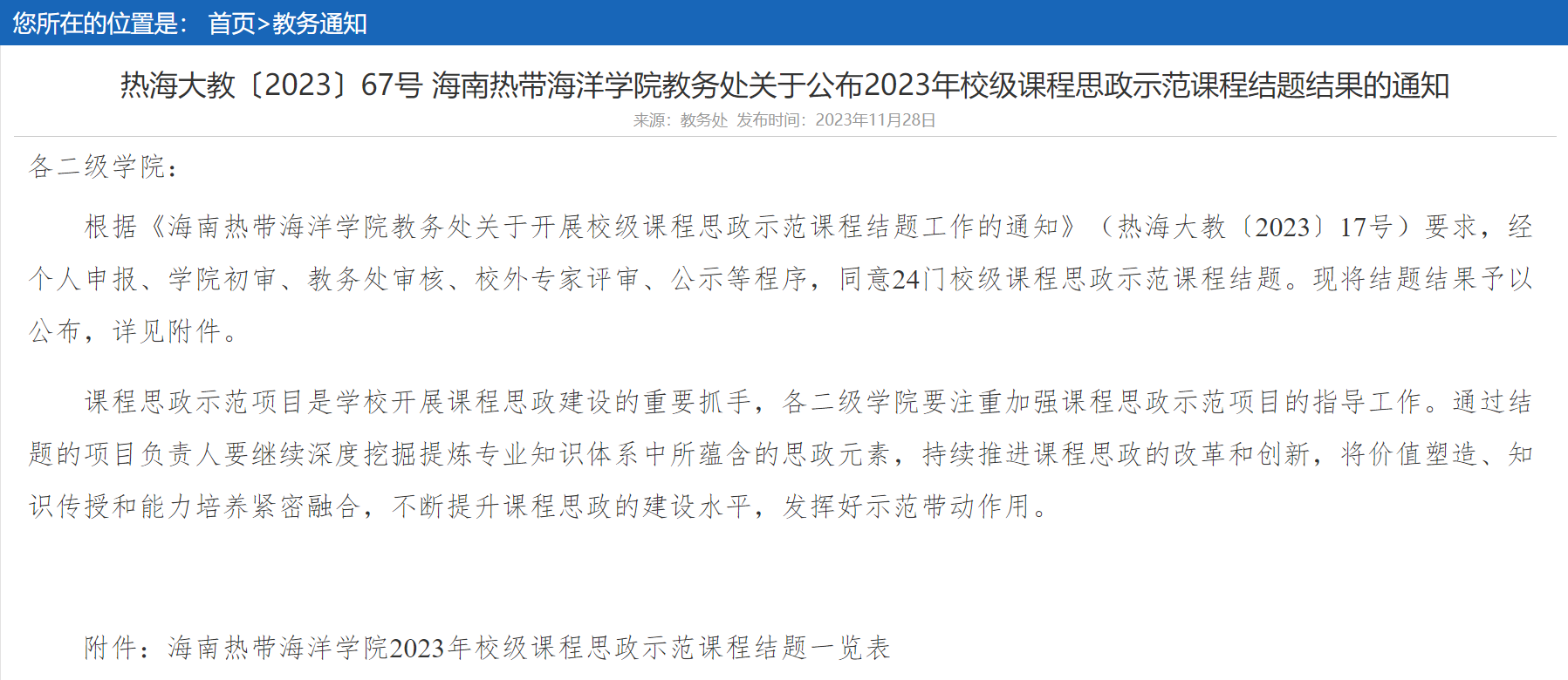根据WilliamHill官方网站教务处发布的《热海大教〔2023〕67号 WilliamHill官方网站教务处关于公布2023年校级课程思政示范课程结题结果的通知》,由WilliamHill中文官方网站刘世杰老师主持,WilliamHill中文官方网站刘柏峰老师参与的课程思政示范课程《轮机概论》(RHKSsk2022-08)获结题。
